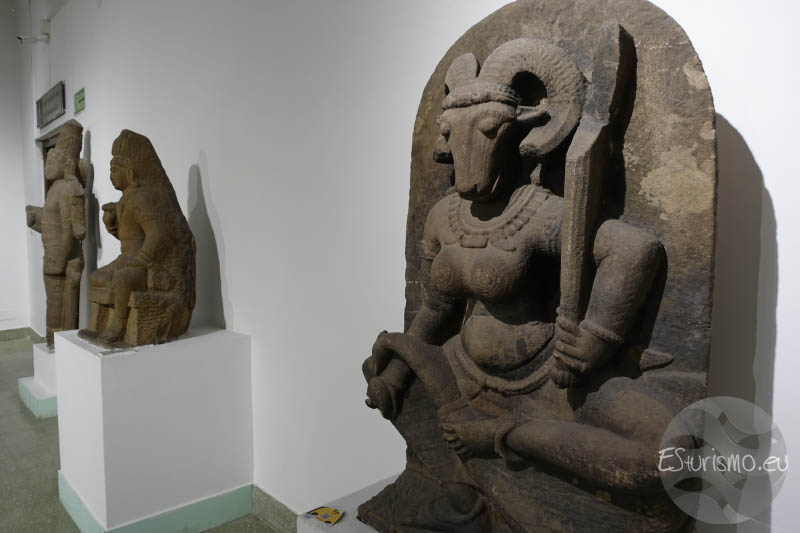 Entre las esculturas sobresalen varias como la de Bharata (siglo XIV), la figura de Mohini del siglo XI situada delante de un árbol frutal, la de Bhu Devi del siglo XVII, la diosa de la tierra Prithivi, etc.… La escultura de Nataraja del siglo IX-X d.C. procedente de Thiruvarangulam, posee una pose de “chatura-tandava” y está representada con tres ojos y cuatro brazos mientras danza. Su pie derecho pisa con decisión al demonio de la ignorancia Apasmara, mientras que la mano derecha trasera sostiene el “damaru” y la mano derecha delantera está en posición “abhaya-mudra”, con una serpiente enrollada alrededor del antebrazo. Las curvaturas situadas en los lados inferiores servían de soporte cuando era sacada en procesiones ceremoniales.