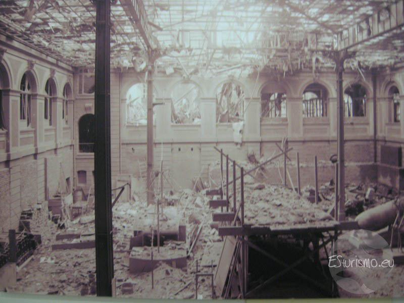 Bajamos ahora a la planta de abajo donde está el patio central en el que se exponen los esqueletos de los diferentes dinosaurios. Nos llama la atención unas fotos que encontramos en nuestro camino en las que se ven la sala central del museo tomadas en el años 1946, en ellas apreciamos que ni la cultura ni los museos salen indemnes de los daños acaecidos durante la II Guerra Mundial.