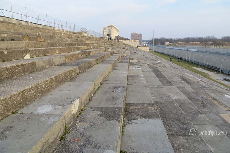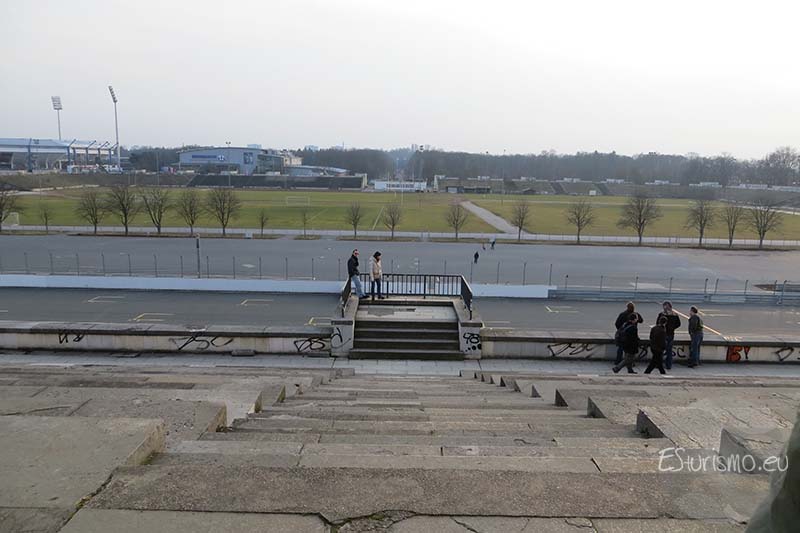 El campo, de 100.000 metros cuadrados se encuentra enmarcado por tres de sus lados por las gradas de 6 metros de alto y compuestas por 34 torres simétricas que tenían la función de dividir la zona del graderío, a la vez que servían para alojar las instalaciones sanitarias. En cada una de ellas hay montados seis postes blancos de banderas, con lo que en conjunto habría muchas enseñas nazistas ondeando en el campo.