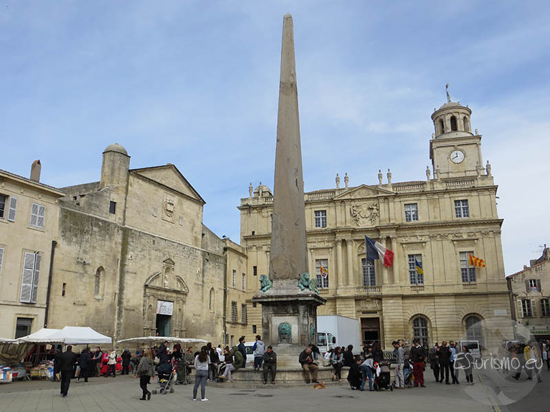Esta plaza se encuentra rodeada de diferentes monumentos que dan buena cuenta de la vertiginosa historia de la ciudad, desde la época romana hasta el siglo XVII, pasando por la etapa del arte románico. Pero vayamos por partes, estamos en el corazón de la ciudad de Arlés, resultado de un ajuste gradual para adaptarse a múltiples operaciones arquitectónicas y urbanísticas. Por ejemplo, en la Edad Media se reducía a un patio estrecho entre la iglesia de san Trophine y la de santa Ana, el resto del área que vemos hoy estaba ocupada por varios bloques de viviendas.