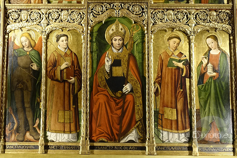 Ahora vemos otra de las joyas de la Catedral que proviene de la primera iglesia: el retablo de san Nicolás terminado para el Gran Jubileo del año 1500 por Louis Bréa. Cuando se terminó la primera iglesia en este lugar en el año 1321, san Nicolás era el santo más venerado de Mónaco, por ello, el retablo que vemos fue pagado por toda la población de este país. Durante la persecución de cristianos en el año 310, Nicolás fue capturado y torturado, aunque sobrevivió para convertirse en el obispo de Myra, en la costa sur de la actual Turquía. En este retablo, que cuenta con un tamaño de 2,02 por 2,60 metros, el santo se encuentra sentado en un trono sosteniendo con su mano izquierda una cruz episcopal, mientras que con la derecha levanta dos dedos como señal de bendición.