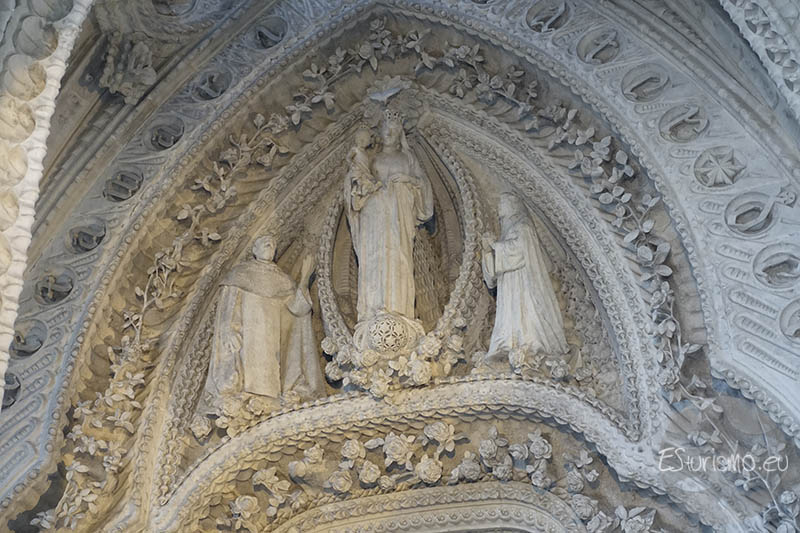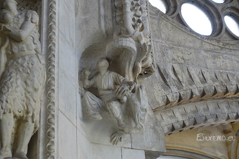Aquí vemos también una elegante linterna que descansa sobre ocho columnas salomónicas, cada una distinta de las demás. Gaudí encargó las esculturas de este portal a Llorenç Matamala i Piñol (amigo cercano del arquitecto y uno de sus colaboradores más leales), autor de la figura central de la Virgen del Rosario con el niño Jesús, acompañada por san Domingo y santa Catalina. Justo debajo, colocados a ambos lados del portal, se encuentran los profetas y los reyes bíblicos (Isaac, Jacob, David y Salomón). A la izquierda vemos un anciano moribundo que recibe la bendición de Jesús, María y José, simbolizando la muerte de una persona justa.