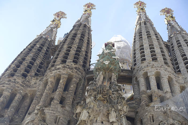 Al colocarse frente a la fachada del Nacimiento de Jesús la primera percepción que se siente es una especie de montaña llena de vida. Y es que Gaudí quiso que transmitiera vida, alegría y celebración, por lo que la concibió como una exaltación de la creación divina y de la vida en todas sus formas, en contraposición con la dureza y el sufrimiento que protagonizan la fachada de la Pasión. Por eso la fachada está llena de representaciones de animales, como conchas, aves, gallinas, patos, águilas, y de numerosos elementos vegetales como rosas, almendros, cerezos o lirios, que simbolizan la vida y celebran el nacimiento de Jesús. Para lograr una gran fidelidad en las figuras, Gaudí trabajaba a partir de modelos reales, tanto de personas como de animales. Tras elaborar las maquetas en yeso, las colocaba directamente en la fachada para comprobar su efecto, y solo cuando quedaba satisfecho se procedía a tallarlas en piedra.
