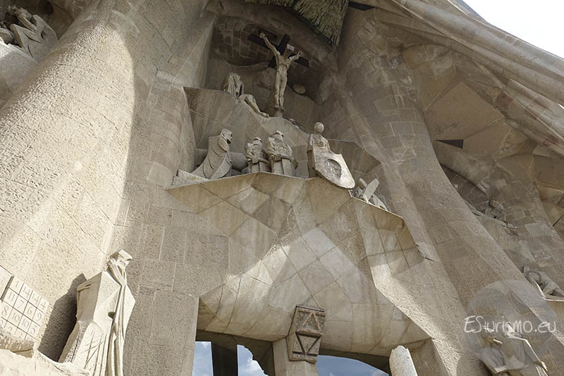 En la escena, Jesús aparece en la cruz, rodeado por varias figuras: María Magdalena arrodillada, María de Cleofás y la Virgen María, cuyo rostro cubre mientras san Juan la sostiene y la consuela. En la base de la cruz, una calavera representa la muerte y hace alusión al lugar de la crucifixión, conocido como Gólgota que significa “cráneo” en arameo. Encima de la escena de la crucifixión, Subirachs colocó placas de bronce que evocan el velo del templo que, según los Evangelios, se rasgó al morir Jesús, creando un efecto similar al de un baldaquino que protege y enmarca la composición.