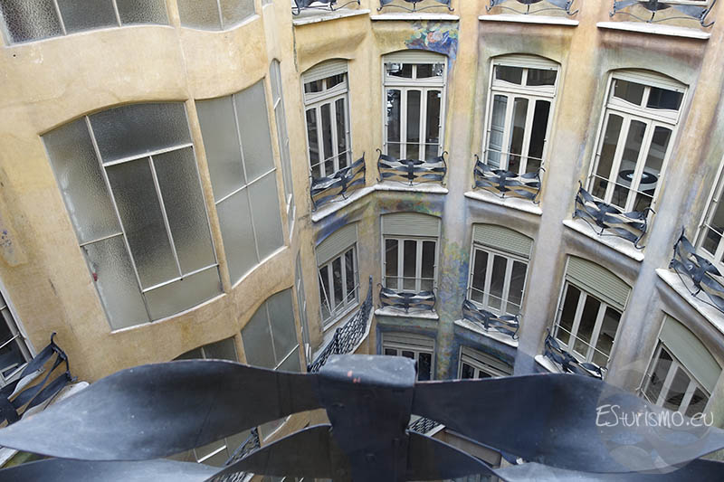 Pero es que desde cualquier punto de la azotea se disfruta de una magnífica vista de Barcelona, con el paseo de Gràcia a un lado y las torres de la ciudad recortándose en el horizonte. La combinación de las vistas y las formas convierte la azotea en un espectáculo donde la arquitectura de Gaudí dialoga con la grandeza urbana de Barcelona. En cuanto a los patios interiores, Gaudí había proyectado una reja perimetral que imitaba las formas ondulantes del edificio, pero el diseño quedó inconcluso. Para evitar riesgos derivados de dejar el espacio abierto, los propietarios optaron por instalar una malla metálica de forma hexagonal que cumple una función protectora.