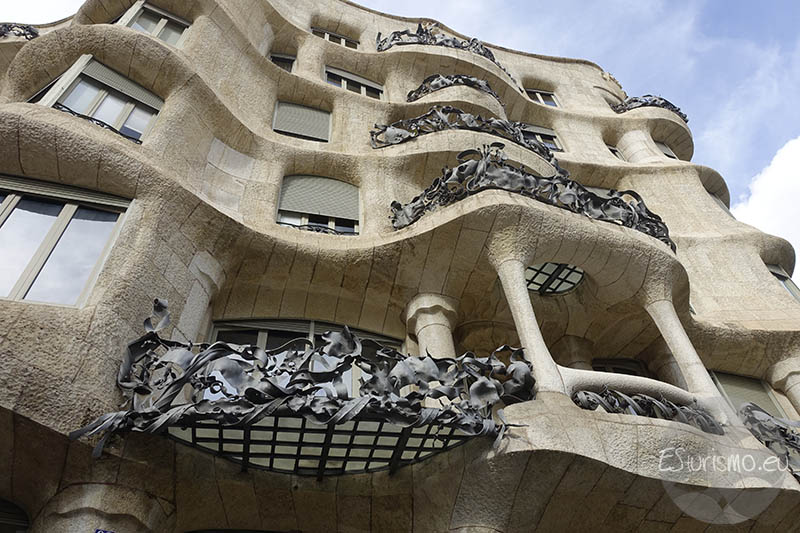 En cuanto a los balcones, no se tratan de elementos convencionales, ya que su gran tamaño, marcado tanto por el saliente de piedra como por la forma cóncava de la fachada, los convierte casi en pequeñas terrazas. Con esta solución, Gaudí rompió con la concepción tradicional del balcón. Además, incorporó una innovación poco habitual para la época: los desagües se colocaron por debajo del nivel del pavimento interior, lo que permitió que desde el interior del piso se tuviera una visión clara de la calle.