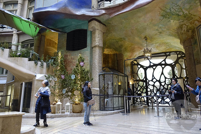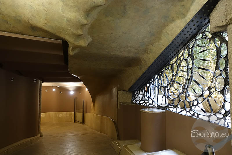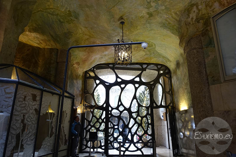 Las puertas funcionan al mismo tiempo como reja y como acceso: la abertura central permitía la entrada de automóviles y los laterales estaban pensados para el paso cotidiano de los residentes. Por su parte, los vestíbulos son espacios amplios, sin ángulos rectos, cuyas paredes presentan acabados que combinan pintura mural con motivos florales y figuras antropomorfas, además de relieves y elementos de yeso. Desde el inicio, Gaudí evitó la separación clara entre estructura y decoración.