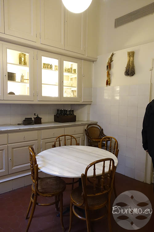 Enseguida llegamos a la cocina, uno de esos espacios donde Gaudí demuestra que su genialidad no era sólo estética, sino también práctica y adelantada a su tiempo. Y es que, a diferencia de los salones nobles, la cocina estaba pensada para el trabajo diario del servicio, así que Gaudí se obsesionó con que fuera cómoda, higiénica y eficiente, nada de adornos innecesarios: aquí manda la lógica. Para ello, gracias al patio interior, la cocina recibe aire fresco constante, algo revolucionario a principios del siglo XX, además los techos son altos para ayudar a disipar el humor y el calor. Por otro lado, los azulejos blancos biselados en las paredes son fáciles de limpiar y muy luminosos, algo que en su momento fue también toda una innovación.