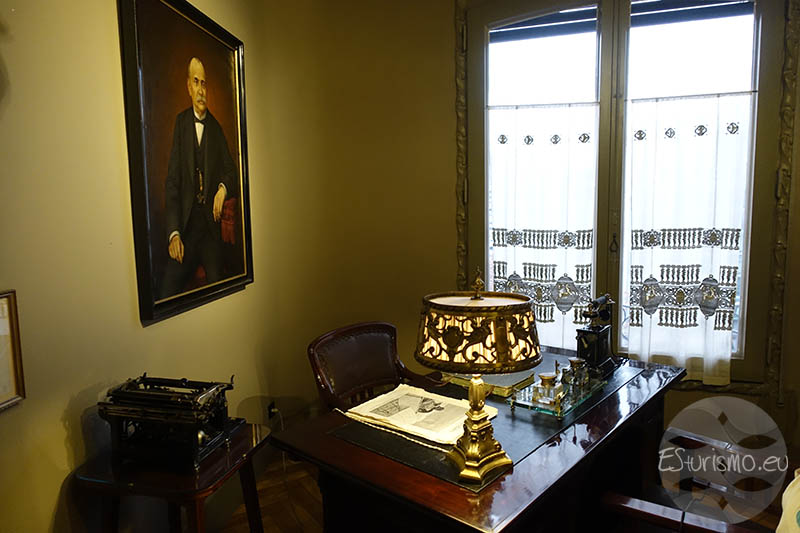 En el despacho del propietario de la vivienda, podemos ver un lugar donde la sofisticación y la utilidad conviven con la inconfundible sensibilidad artística de Gaudí. El techo, modelado con formas ondulantes y patrones geométricos, aprovecha la entrada de luz natural para generar una atmósfera dinámica, casi viva. Los muebles, elaborados en madera rojiza, destacan por su solidez y por el minucioso trabajo artesanal de sus líneas.
