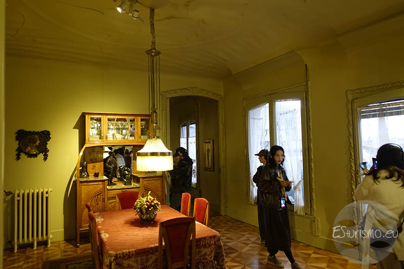 Nos encontramos ya en el comedor principal, un espacio presidido por una gran mesa y mobiliario de madera noble cuidadosamente trabajada, que deja ver la influencia modernista característica de Gaudí. Los sillones y los aparadores se integran con elegancia, creando un ambiente equilibrado y acogedor. Entre los detalles más sugerentes destaca un juego de café de plata, evocación directa del modo de vida y las costumbres de la familia Milà. Todo el conjunto transmite una sensación de sofisticación cálida, donde lo cotidiano adquiere un valor artístico. En el centro del espacio, una lámpara de hierro forjado parece suspendida en el aire, concebida para dialogar con las curvas del techo y reforzar la armonía del conjunto.
