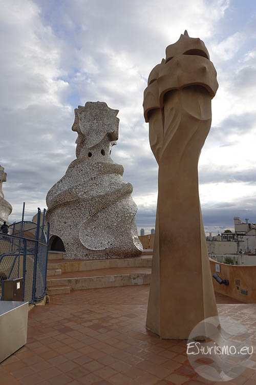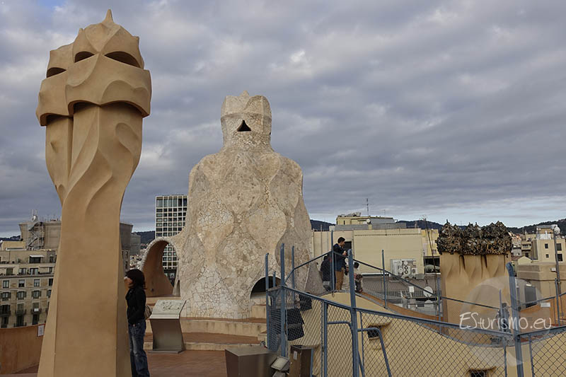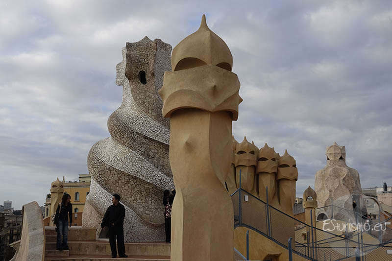 Otros de los elementos que llaman poderosamente la atención en la azotea de La Pedrera son las veintinueve chimeneas que se distribuyen por todo el espacio, convirtiéndolo en un paisaje escultórico único. Estas estructuras servían antiguamente como salidas de humo de la calefacción central de carbón, hoy ya en desuso. Dos de ellas aparecen aisladas, mientras que el resto se organiza en grupos de distintas cantidades, creando un ritmo visual muy característico.