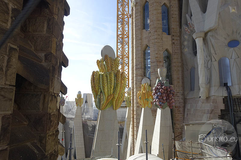A lo largo del recorrido, como decimos gracias a las numerosas ventanas que nos vamos encontrando, podemos admirar más de cerca algunos cimborrios, así como algunas iconografías que Gaudí empleó en el exterior del templo. Además, de vez en cuando nos asomamos para poder ver los remantes de las naves laterales de la sacristía consistentes en cestas repletas de frutas (como manzanas, higos, naranjas, melocotones, almendras, ciruelas, granadas, cerezas, peras, caquis, castañas y nísperos), realizadas por el escultor Etsuro Sotoo, que representan simbólicamente la abundancia de los dones del Espíritu Santo derramados sobre la Humanidad.