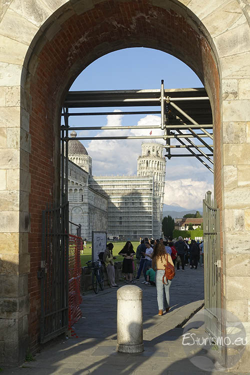 La torre de santa María servía como defensa del puente sobre el antiguo cauce del río Auser (el actual Serchio, que entonces bañaba las defensas de la ciudad). Fue la primera que se construyó junto a las murallas, entre los años entre 1155 y 1161. Derribada durante el dominio florentino, al igual que todas las demás torres de la ciudad, la parte superior fue reconstruida en el siglo XIX para alberga una cisterna que se utilizaba para regar el césped de la Piazza dei Miracoli. Es uno de los cuatro accesos de entrada y salida a la pasarela elevada, y en su base se encuentran la taquilla y una pequeña librería. Este primer tramo de muralla se completa con la torre y puerta de san Esteban (Santo Stefano), situada en el extremo oriental de la plaza. Durante la Edad Media marcaba un cruce esencial: en aquella época, Pisa se encontraba entre dos ríos, el Arno al sur, por donde aún fluye hoy, y el Auser al norte, el antiguo curso del Serchio que flanqueaba las murallas. Por lo que la torre defendía un puente que permitía cruzar el río y llegar a la aldea extramuros, que surgió alrededor de la iglesia de Santo Stefano.