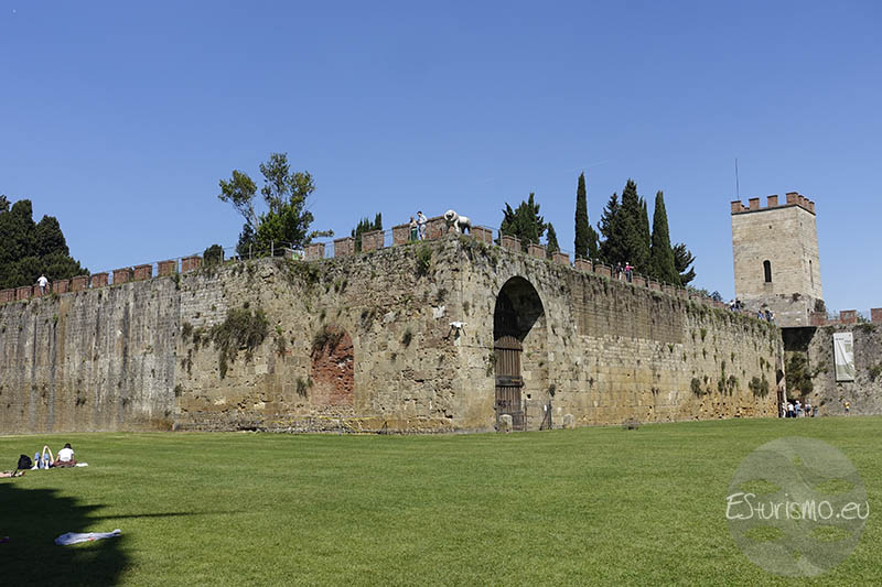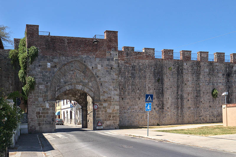 Centrándonos en este lienzo sobre el que se puede caminar, y partiendo desde el oeste (es decir en la Piazza dei Miracoli) y en orden sucesivo, se encuentran la Porta Nova o de Santa María, la cual es el acceso más reciente de la muralla medieval, ya que fue abierta en 1562 por orden de Cosimo I de’ Medici, entonces duque de Florencia. Con el tiempo vivió episodios singulares, como el paso de un tren militar durante la Primera Guerra Mundial para llevar heridos al hospital cercano, o durante los años treinta, cuando se abrieron dos accesos laterales para peatones, ya que por la propia puerta transitaban los tranvías que unían la estación central con la plaza de los Milagros.