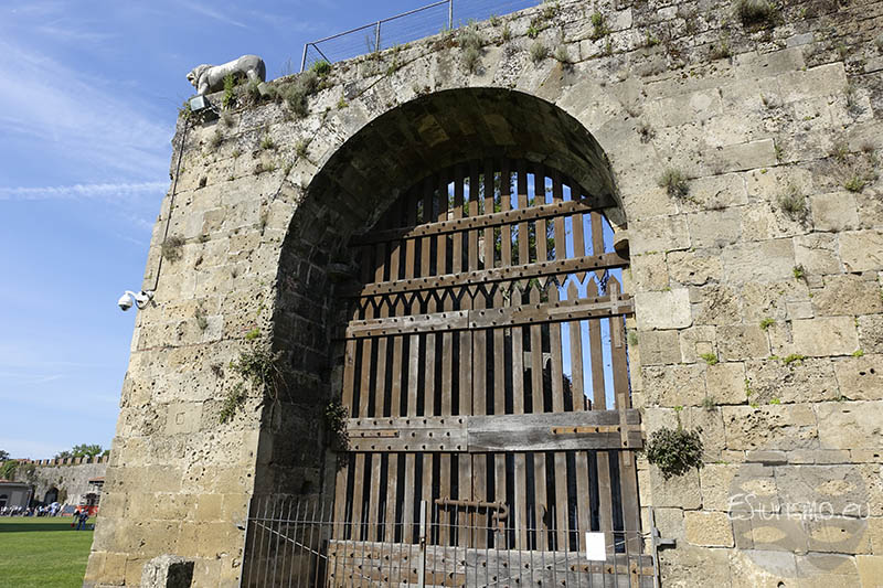 Ahora llegamos a la torre y la Puerta del León (reconocible por el león de piedra que la custodia): la torre, al igual que la anterior y la de Santa María, era una de las principales defensas de la ciudad. Recibía su nombre por esta escultura felina que se alojaba en un nicho de su estructura superior, la cual fue demolida tras la conquista de Pisa en 1406 por los florentinos. La estatua representa a un león de mirada desafiante de época romana, que fue colocada en aquella posición para intimidar a quienes cruzaban la puerta principal de la ciudad en época medieval. Durante el dominio florentino la obra fue trasladada y girada hacia el interior como gesto simbólico que marcaba la rendición y obediencia de Pisa.