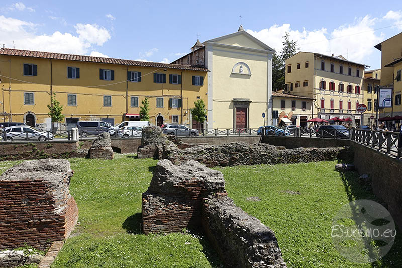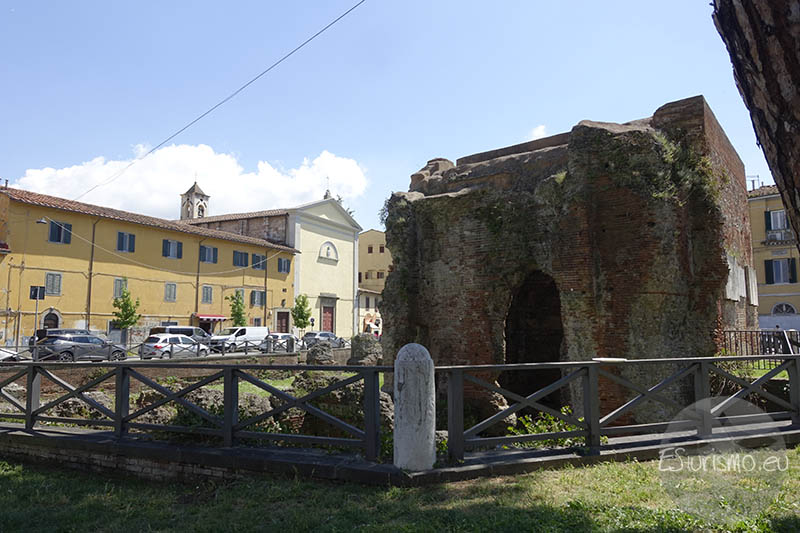 Al atravesar la puerta de Lucca todavía se distinguen las antiguas termas, uno de los pocos testimonios que quedan en Pisa de la época romana. Estas construcciones se levantaron a finales del siglo I d. C., bajo el mandato del emperador Domiciano, y se sitúan justo frente a la iglesia de san Torpes. Allí se conserva la cabeza del mártir cristiano que, según las crónicas, fue decapitado por orden de Nerón. La tradición cuenta que, tras su muerte, el cuerpo fue depositado en una barca junto con un perro y un gallo, y dejado a la deriva en la desembocadura del Arno. Tras salir al mar, la embarcación habría acabado varada en el lugar que más tarde adoptó su nombre: Saint Tropez (Francia).
