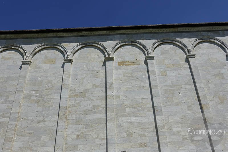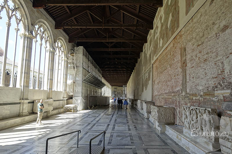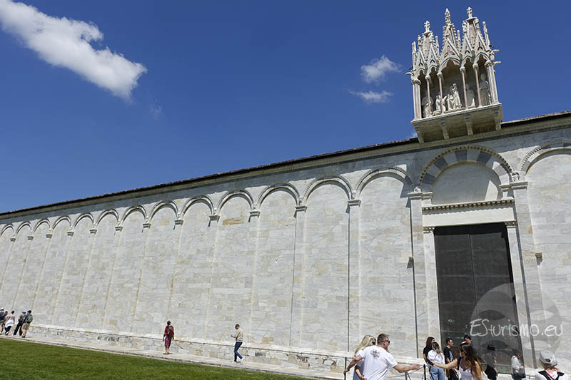 El revestimiento de mármol blanco del muro hace que encaje con armonía en el conjunto monumental y su decoración, a base de 43 arcos ciegos, retomaba las formas románicas empleadas en la catedral siglos antes, en lugar de seguir la moda gótica de la época. En los arranques de los arcos se aprecian pequeñas testine (cabecitas escultóricas) que animan el relieve del muro. El ritmo constructivo en el resto del edificio, sobre todo en las zonas norte y occidental, fue más lento y solo culminó a finales del siglo XIV. Las dificultades económicas y políticas tras la peste negra influyeron en esta ralentización: un ejemplo claro es el muro norte, donde se proyectaron catorce capillas privadas, pero apenas dos llegaron a levantarse por la falta de mecenas. La gran cubierta de plomo que se terminó a fines de ese siglo marcó prácticamente el cierre del proyecto, poco antes de que Pisa perdiera su independencia frente a Florencia.