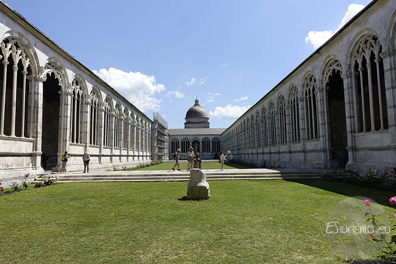 En su diseño inicial los corredores se abrían mediante una serie de arcos de medio punto sobre parapetos bajos que permitían contemplar el espacio verde central. De igual manera, seis accesos daban paso a los visitantes hacia la explanada abierta. Para entender la importancia de este patio hay que saber que la versión revisada del proyecto del Camposanto se fundamentaba en un nuevo concepto de sacralidad vinculada al lugar: ya no era el templo lo considerado sagrado, sino el propio suelo del recinto. Y esto es debido a que, según una antigua tradición, se cubrió de tierra que fue traída por los pisanos en la Tercera Cruzada (o según algunas fuentes la Cuarta) desde el Monte Calvario en Jerusalén, razón por la cual se le dio el nombre de Campo Santo. Hasta el siglo XV, esa denominación solo hacía referencia a este edificio de Pisa, después se extendió como un término común para designar cementerios.