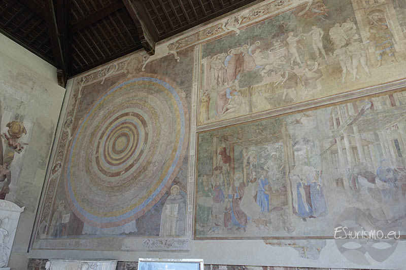 La pared norte del Camposanto finaliza, aunque más bien abría la serie de las escenas del Antiguo Testamento, con el fresco de la Cosmogonía o Creación del mundo, pintada por Piero di Puccio en el siglo XIV. El fresco representa simbólicamente la creación del universo según el Génesis: círculos concéntricos rodean la esfera terrestre y muestran los distintos niveles cósmicos, mientras Dios, en lo alto, ordena el caos. Más que narrativo, es un esquema didáctico y teológico que introduce la historia bíblica desde la Creación hasta los patriarcas. A continuación vemos el fresco de la Creación de Adán y Eva, el Pecado Original y la Expulsión del Paraíso. De este modo, el espectador pasaba de la visión cósmica del universo creado por Dios al inicio mismo de la historia humana y del pecado, que marcaba el rumbo de toda la narración bíblica representada en el Camposanto.