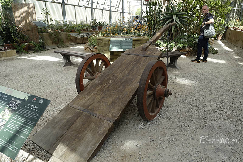 Entre ambos grupos geográficos se sitúa un objeto histórico: “il palone”. Este carro fue fabricado en la segunda mitad del siglo XIX para transportar grandes macetas, especialmente para moverlas entre los invernaderos y el exterior según la estación. Por tanto, se trata de un ejemplo de artesanía local cuyo diseño optimizaba el equilibrio de la carga con la construcción de ruedas bien proporcionadas. En la parte frontal se observan dos orificios simétricos cerca del timón, lo que indica que probablemente estuvo adaptado para ser tirado por animales. Con el paso del tiempo, la estructura había sufrido daños y perdido diversas piezas. Antes de su restauración en 2016 por el Jardín Botánico se realizó una investigación histórica, durante el cual, se conservaron y reforzaron los elementos originales siempre que fuera posible, reemplazándose las partes irreparables con reproducciones de madera de castaño y fresno.