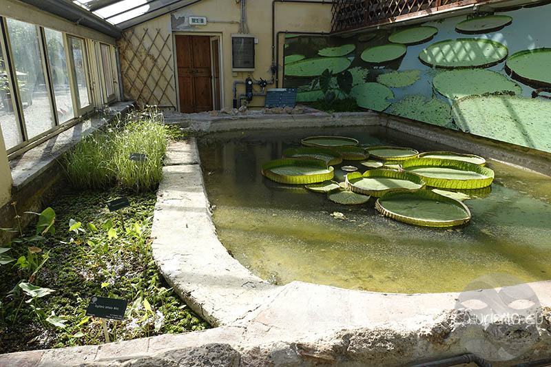 Las plantas del invernadero se organizan en grandes parterres según su procedencia y hábitat, agrupándose conforme a sus necesidades ecológicas. Para favorecer su desarrollo, sólo se controla la temperatura, manteniéndola alta incluso en invierno, mientras que el agua varía dependiendo de las necesidades de la especie. Entre las especies más destacadas están el baobab, conocido por su tronco en forma de botella; la strelitzia, con flores que recuerdan a un ave; la Cycas circinalis, que puede superar los 10 metros de altura; y el drago, famoso por su savia rojiza llamada “sangre de dragón”. En el exterior del invernadero, casi anexos a éste, vemos una serie de estanques (23 rectangulares y uno circular) creados en 1817 para cultivar plantas propias de los humedales de Pisa. Estas plantas, llamadas hidrófitas, están adaptadas al agua y pueden ser flotantes o enraizadas. Algunas especies, como la castaña de agua o el trébol acuático, casi han desaparecido por la contaminación y la pérdida de zonas húmedas. Otras, como el nenúfar o la violeta de agua, hoy sólo se encuentran en áreas protegidas.