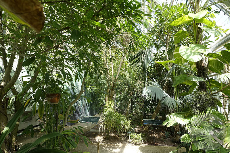 Para reproducir el ambiente necesario para las plantas tropicales, el invernadero se mantiene a más de 18 °C, con una humedad del 60-70%, además de asegurar iluminación adecuada todo el año. Las plantas están organizadas por zonas geográficas, mientras que en los grandes parterres se cultivan especies tropicales de uso alimentario, como caña de azúcar, plátano, café y mango. En la pared derecha se encuentran plantas herbáceas muy usadas como especias y condimentos, entre ellas pimienta, jengibre, cúrcuma y vainilla. El otro invernadero, el llamado Victoria contiene plantas exóticas, en las que destacan los nenúfares gigantes.