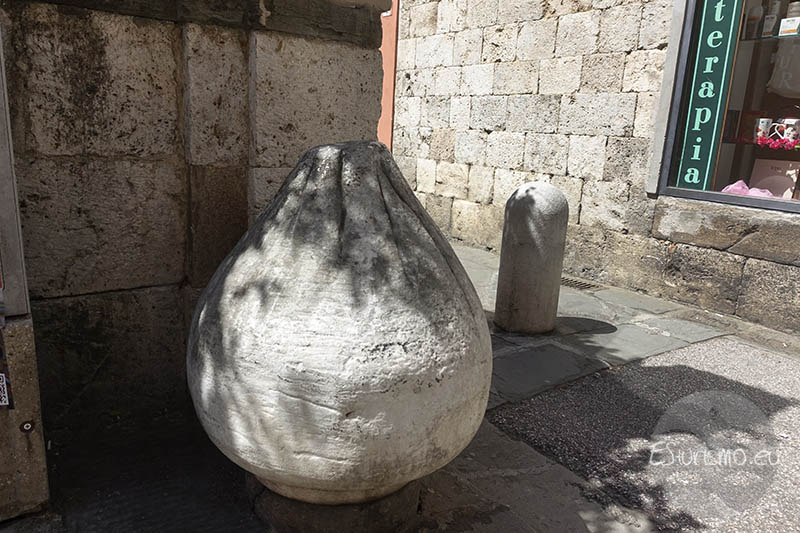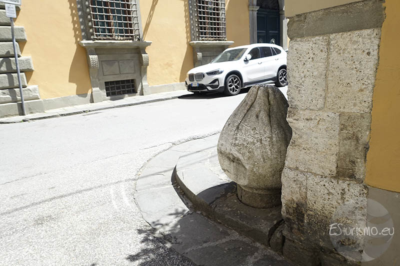 En la esquina con Via la Pera encontramos un cipo etrusco con forma de pera que constituye una muestra del arte artesanal local, caracterizado por la creación de estructuras funerarias de mármol. Su origen se remonta a la segunda mitad del siglo VI a. C. Tradicionalmente, estos cipoi se colocaban sobre una base decorada con protomos de carnero en las esquinas. La marcada influencia jónica del norte que se aprecia en este tipo de obras es resultado de la dispersión de pueblos jonios tras la conquista persa, fenómeno que impactó a toda la Etruria septentrional, manifestándose con particularidades distintas en las diversas ciudades etruscas.