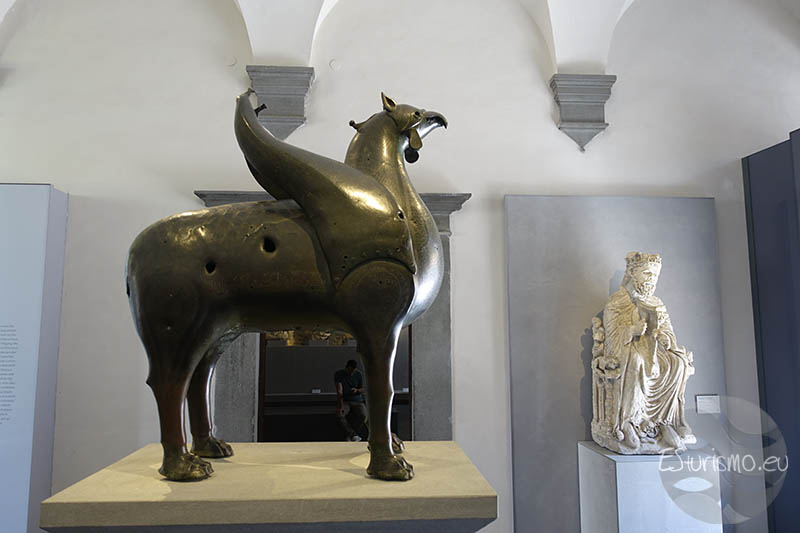 Entramos a la sala 3 (“Llegadas del otro lado del mar”): los edificios de la Piazza del Duomo fueron levantados entre los siglos XI y XIII, momento en que Pisa se consolidó como una poderosa república marítima. No sorprende, por ello, que además de reflejar diversas corrientes artísticas, también alberguen piezas procedentes de distintas regiones del Mediterráneo. En el muro opuesto a la entrada se encuentra una escultura de mármol que representa al rey David tocando el arpa, obra realizada en la Provenza y con claras afinidades estilísticas con otras esculturas de esa zona. En el centro de la sala destaca un Grifo de bronce procedente de España que hasta 1828 coronaba el tímpano del ábside de la catedral, antes de ser reemplazado por una copia. Esta pieza es uno de los ejemplos más reconocidos del arte islámico occidental, caracterizado por sus formas sintéticas y las inscripciones en caligrafía cúfica con mensajes de buen augurio.