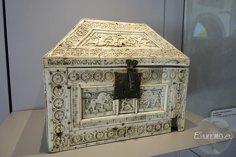 En cuanto al metal y esmalte del título de la sala, aquí se exponen dos pequeños pero valiosos relicarios, cuyas características arquitectónicas corresponden con los de los talleres de Limoges entre los siglos XII y XIII. Las piezas, elaboradas con cobre dorado en sus zonas visibles, incorporan inserciones de esmaltes en intensos tonos azul oscuro, celeste y verde, reflejando la importancia de la policromía en el arte litúrgico medieval.