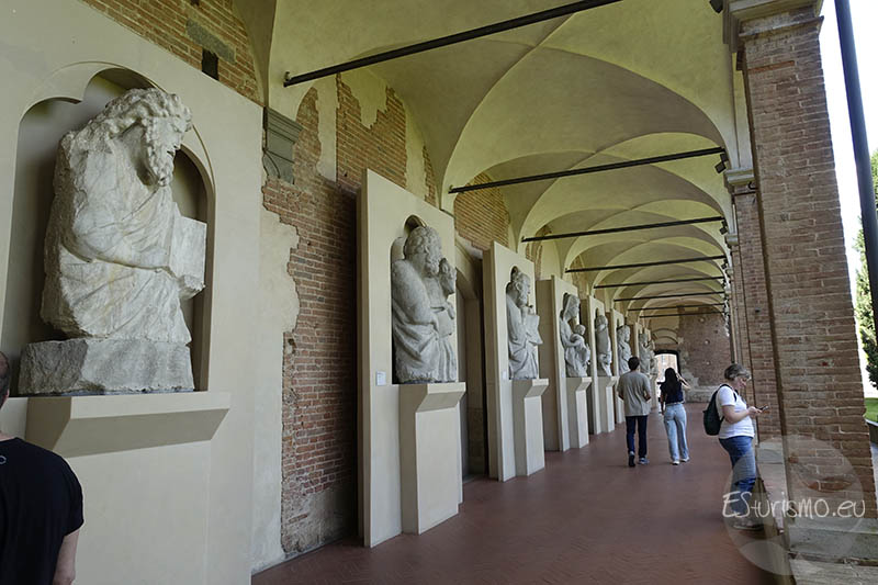 Antes de continuar con el recorrido por las siguientes salas, decidimos salir al antiguo claustro que pertenecía al seminario. Este espacio, con su majestuosa arcada en forma de L, no solo regala una hermosa perspectiva de la Torre de Pisa, sino que también alberga esculturas procedentes de la parte superior del baptisterio, algunas ya vistas al inicio de la visita. En lugar de pequeñas figuras, aquí aparecen bustos de gran tamaño, representados desde la cintura hacia abajo, que en su origen estaban pensados para decorar los arcos bajo el frontón gótico. Aunque el paso del tiempo ha deteriorado estas piezas, todavía reflejan la audacia y creatividad del joven Giovanni Pisano, quien las concibió para ser admiradas desde abajo y a lo lejos.