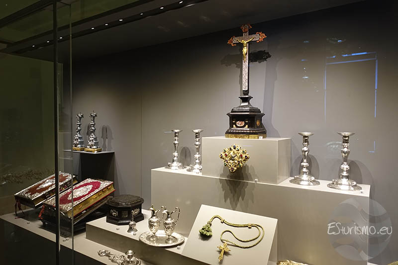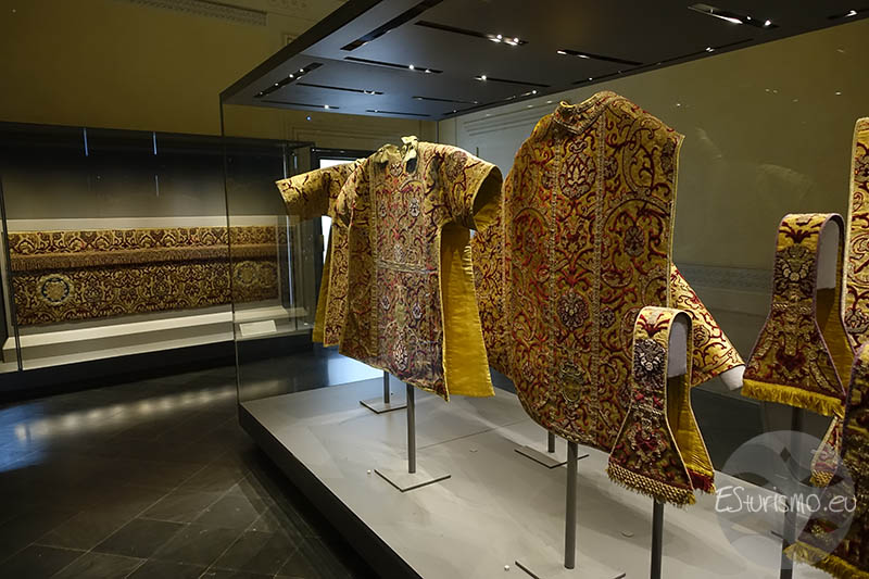 Y es que los dos espacios expositivos que vienen a continuación (“Vestimentas litúrgicas 1 y 2”) también siguen esa temática. En el primero de ellos, la sala 17, se exhiben vestiduras litúrgicas de los siglos XVII y XVIII, que destacan por la riqueza de sus tejidos y diseños decorativos. Algunas piezas fueron elaboradas en sedas e hilos metálicos preciosos de gran calidad, trabajados con gran destreza. Las más valiosas probablemente proceden de los prestigiosos talleres romanos de la corte papal.