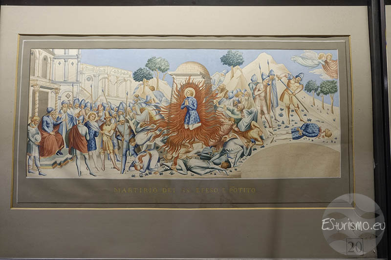 Subimos ya al primer piso donde seguimos viendo sinopias de gran tamaño, como las del “Juicio final y el infierno” o la del “Incendio de Sodoma”. A lo largo del pasillo se han dispuesto otras obras maestras del depósito de la colección “Primaziale”, que han sido restauradas o se encuentran en proceso, cuya labor a determinadas horas se hace en directo para que el público puedo ver su desarrollo. Esos eventos culturales relacionados con la restauración y la conservación con enfoques históricos, se suelen intercalar con otras exposiciones temporales.