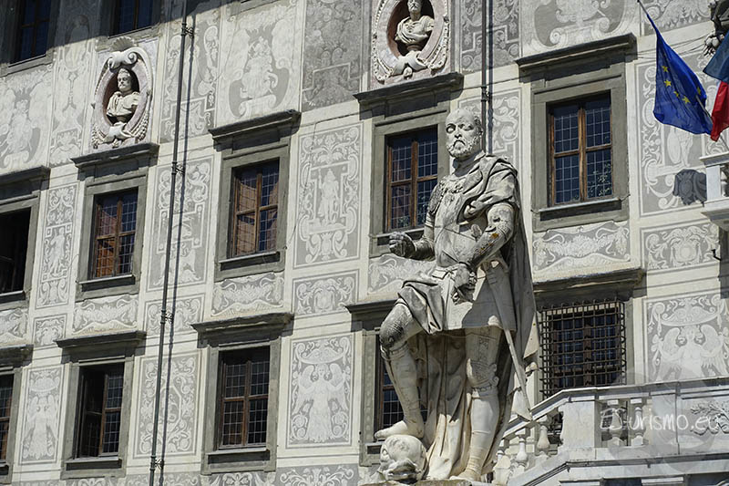 Hoy en el centro de la plaza se alza la estatua de Cosme I que fue esculpida por Pietro Francavilla en 1596, mientras que, entre los edificios más destacados que la circundan, se encuentran el palacio de la Carovana (1562-1564), la iglesia de san Esteban de los Caballeros (1565-1569), el palacio de la Rectoría (1566), el palacio del Consejo de los Doce (1603), el palacio Puteano (1594-1598), la iglesia de san Rocco (1575) y el palacio del Reloj (1605-1608). Vamos a ir comentando cada uno de estos edificios.