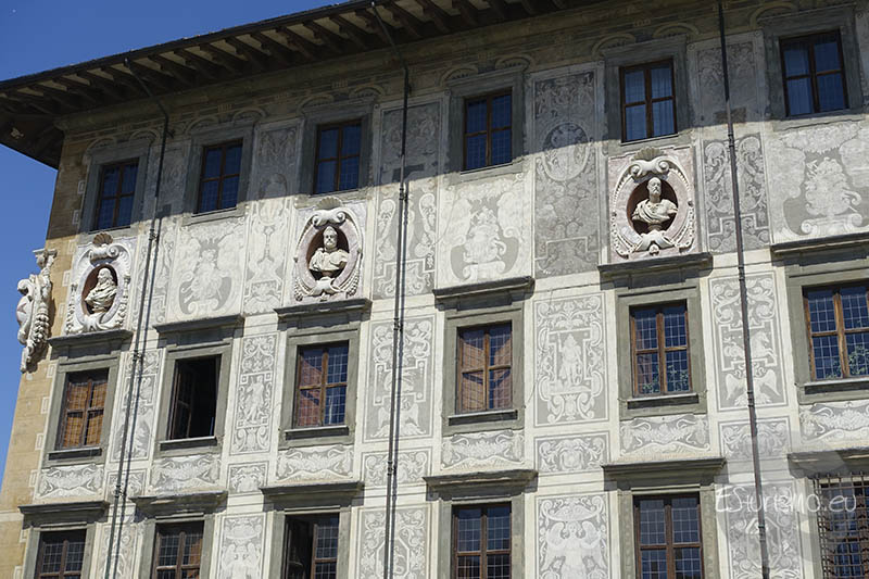 En la parte superior de la fachada se pueden observar los bustos de medio cuerpo de los duques Médici: Cosme I, Francisco I y Fernando I, los cuales fueron esculpidos por Ridolfo Sirigatti entre 1590 y 1596; el de Cosme II, realizado alrededor de 1663 por Pietro Tacca; y los de Fernando II y Cosme III hechos por Giovanni Battista Foggini y fechadas en 1681 y 1718, respectivamente. Actualmente, el palacio alberga la Escuela Normal Superior de Pisa y conserva en su interior salas decoradas y pinturas del siglo XVI.