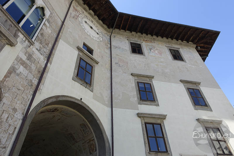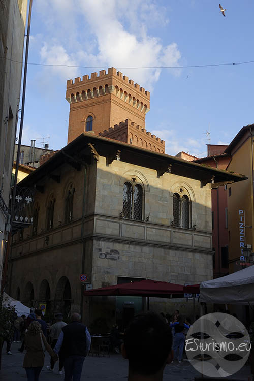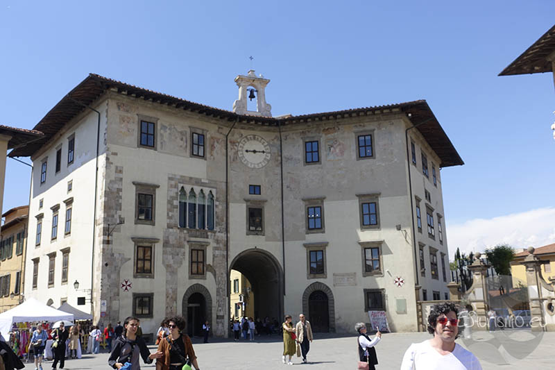 A nuestra izquierda se levanta el Palazzo dell’Orologio (palacio del Reloj), cuyo aspecto actual es fruto de la unión realizada en el siglo XVII de dos construcciones medievales independientes, fusión contextualizada en el comentado proyecto de reorganización urbana de la plaza. Antes de aquella fusión, a comienzos del siglo XIV, la torre situada a la izquierda era la residencia del Capitano del Popolo, mientras que la de la derecha (unida a la anterior por un pasadizo elevado) era la Torre della Muda, llamada así porque allí se encerraban las águilas del Ayuntamiento de Pisa durante la muda de sus plumas, símbolo del poder de la ciudad.