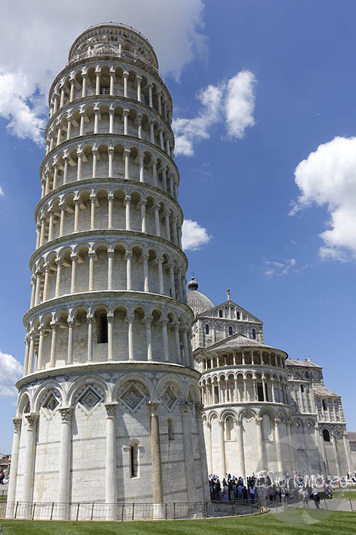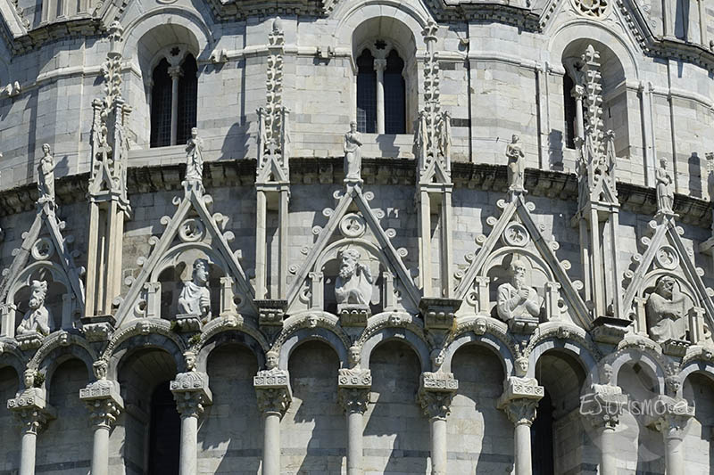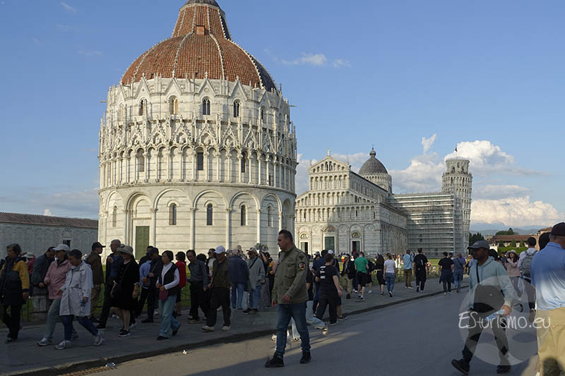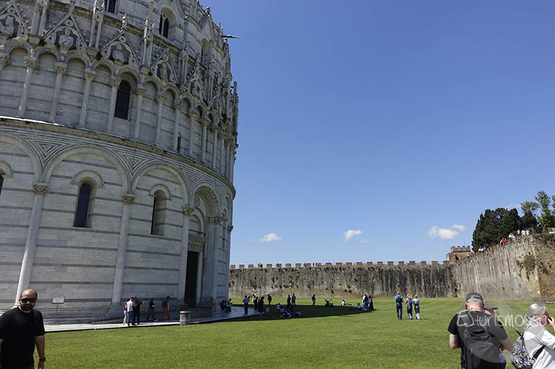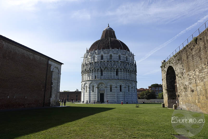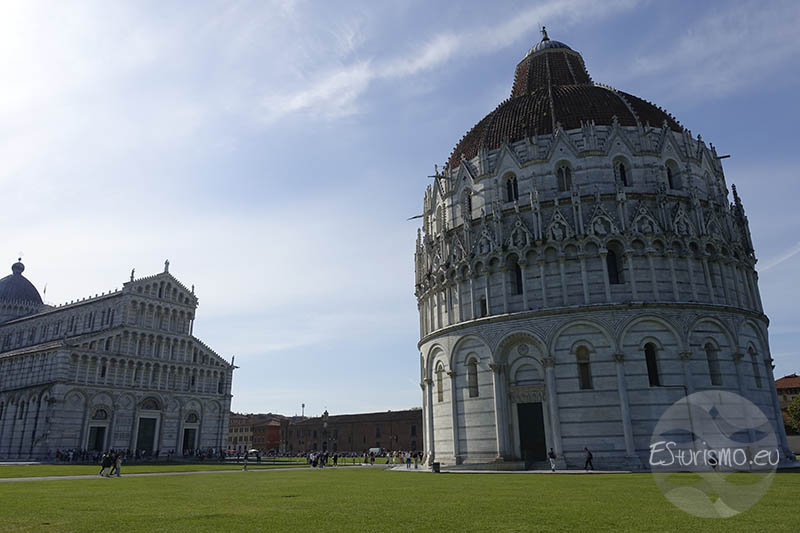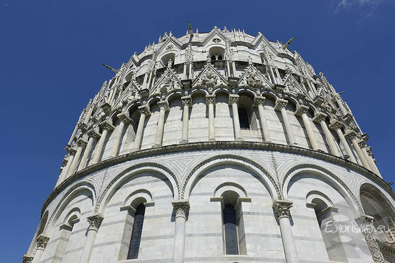 El Baptisterio de San Giovanni (san Juan Bautista), donde se bautizó, entre otros, Galileo Galilei, se comenzó a construir en el año 1152 bajo la dirección del arquitecto Diotisalvi para sustituir a otro anterior, y fue terminado en el 1363 ahora bajo la dirección de Nicola Pisano, junto con su hijo Giovanni, quien introdujo cambios radicales en la estructura de Diotisalvi. La razón por la que se construyó este edificio fue la de dotar a la catedral de un complemento digno que, en cuanto a ubicación, tamaño, materiales y estilo, pudiera armonizar con el mismo edificio de la catedral. Si te fijas bien verás que el baptisterio también está un poco escorado hacia un lado (- 0,6 grados en la dirección de la Catedral), es decir que, al igual que le pasó a la Torre de Pisa, se ha hundido en el terreno blando y arcilloso de la plaza.