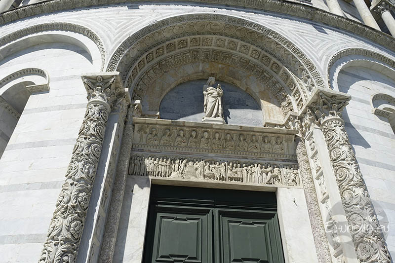 El edificio posee cuatro puertas que coinciden con los cuatro puntos cardinales. La entrada principal es la que se sitúa en el lado este, cuyo portal se encuentra decorado con relieves que narran los meses del año, figuras apostólicas y acontecimientos relacionados con la vida de san Juan Bautista. Aquellos bustos situados en los arcos de la logia exterior son obras de Nicola Pisano, aunque posteriormente también fueron adornados con figuras esculpidas por su hijo Giovanni. Precisamente, por sus obras escultóricas (tanto interiores como exteriores) han hecho que el baptisterio de Pisa sea considerado el lugar donde comenzó el “Renacimiento” de la escultura, al ser un momento revolucionario para la historia del arte al convertirse lo medieval en moderno.