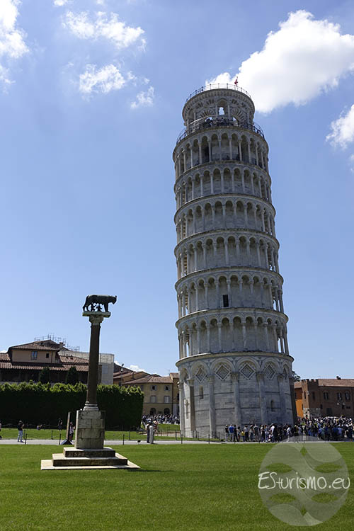 Al lado se levanta una columna coronada por la Loba Capitolina, grupo escultórico que es todo un símbolo de la cultura y el patrimonio de la antigua Roma, todo un testimonio del legado perdurable de la historia romana, a la vez que narra la legendaria historia de Rómulo y Remo, los gemelos fundadores de aquel imperio que fueron amamantados por una loba. Por tanto, la estatua representa la fuerza, la crianza y la fundación de aquella gran civilización. El monumento sirve como escenario perfecto para fotografías: es ideal para tomarlo como referencia vertical para captar perfectamente el ladeo de la Torre de Pisa desde ese lado de la plaza.