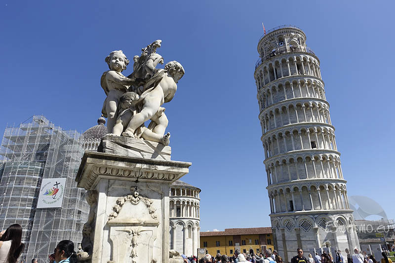 Si ahora dejamos atrás la Torre de Pisa, enseguida nos topamos con la Fontana dei Putti hecha con mármol de Carrara. Fue construida entre 1746 y 1765 por Giuseppe Vaccà y Giovanni Antonio Cybei, basado en un diseño de Giovanni Battista Tempesti. Consta de una sencilla base cuadriforme que presenta motivos de hojas de acanto y relieves de dos tritones luchando contra un monstruo marino. Sobre ese pedestal se encuentran las esculturas de tres querubines (que simbolizan la alegría y la inocencia de la infancia) sosteniendo los escudos de Pisa y del Opera del Duomo. Esta obra, aunque siguió los cánones estéticos utilizados hasta entonces y pese al reconocimiento inicial, fue después reprobado, siendo despreciada durante mucho tiempo por la crítica y el público, incluso se presentaron diferentes propuestas de modificación, pero por fortuna no se realizaron. En la actualidad, gracias a las redes sociales, la fuente goza de una popularidad inesperada, consolidándose como un icono urbano de la plaza.