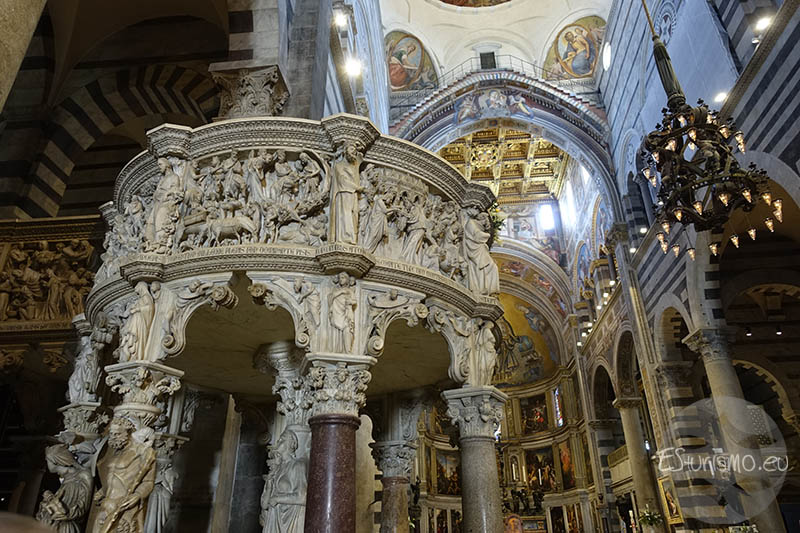 La catedral de Pisa nos ha parecido muy bonita, merece muchísimo la pena recorrer su interior con calma, fijándose en los detalles. Hay que decir, antes de continuar, que es posible visitar sólo un monumento de la Piazza dei Miracoli: Museo delle Sinopie, Museo dell’Opera del Duomo, el Camposanto o el Baptisterio. El precio individual es de 8€ y en todos ellos se incluye la también la visita de la catedral. Tras esta aclaración, seguimos hablando del Duomo de Pisa, destacando el impresionante púlpito de Giovanni Pisano. Y precisamente, junto a ese pulpito, vemos una plataforma apoyada sobre una esfera: se trata del lugar en el que anualmente se celebra el Año Nuevo Pisano, en el que cada 25 de marzo, al mediodía exactamente, un rayo de sol entra por una pequeña abertura del crucero sur e ilumina ese punto. Este efecto señalaba el comienzo del año según la tradición de Pisa, que seguía el antiguo calendario “ab incarnatione”, donde el ciclo anual arrancaba el día de la Anunciación y del equinoccio. Así, la ciudad daba la bienvenida al año nuevo con unos nueve meses de adelanto respecto al calendario vigente hoy. Esta costumbre, registrada al menos desde el siglo X, se mantuvo hasta 1749, cuando el Gran Duque Francesco Stefano di Lorena la eliminó por los problemas que causaba en la documentación oficial.