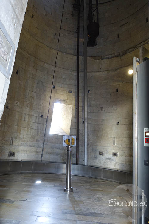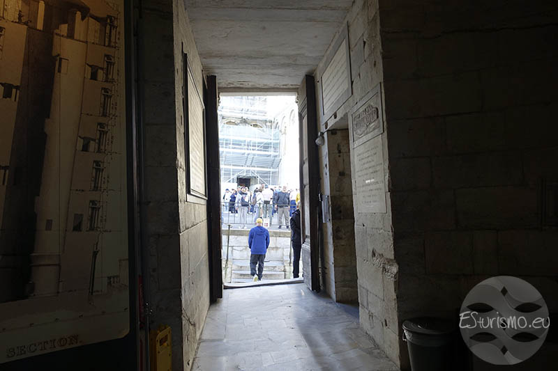 Accedemos pues al interior de la torre de Pisa y lo primero que vemos es una gran placa de mármol a nuestra derecha que fue colocada aquí el 1 de octubre de 1839 para conmemorar (a pesar de ser una leyenda) textualmente que “Galileo Galilei, realizando experimentos desde lo alto de esta torre inclinada sobre la caída de cuerpos pesados y descubriendo las leyes del movimiento, fundó la mecánica y preludió sus propios grandes descubrimientos y éxitos. En recuerdo de este hecho, el caballero Vincenzo Carmignani Operaio del Templo de Pisa dedicó esta lápida de mármol el 1 de octubre de 1839, cuando, por la autoridad y protección de Leopoldo II, Gran Duque de Toscana y protector de las ciencias, los principales científicos de toda Europa acudieron a este gran congreso en Pisa, contribuyendo a las ciencias y las artes italianas.”