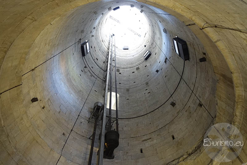 Estamos ya en una gran sala circular, llamada Sala del Pesce (sala del Pez) por un bajorrelieve de este animal justo encima de la ventana de enfrente. Enseguida nos damos cuenta que sorprendentemente es un espacio hueco y sobrio, con una apertura en su parte superior. A diferencia de muchos campanarios llenos de elaborados interiores, el núcleo de la Torre de Pisa es un eje vertical abierto, que se eleva ininterrumpidamente desde la base hasta el campanario. Este vasto vacío amplifica cada sonido y acentúa el eco de los pasos a lo largo de la escalera de caracol de piedra que se aferra entre el muro interno y el externo.