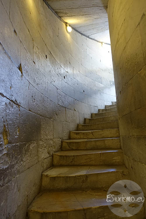 Iniciamos el ascenso a través de una estrecha escalera de caracol que posee 273 escalones, muchos de los cuales se encuentran desgastados, por lo que hay que ir con cuidado puesto que pueden resbalar. Como hemos mencionado anteriormente, estas escaleras recorren el hueco que existe entre el prisma interior y el exterior. Tanto para el ascenso, como para el descenso, andar por aquí es desorientador debido a la inclinación desigual que aumenta a medida que se asciende por los distintos niveles, por lo que en ocasiones a ciertas personas les puede marear. Aun así, es muy emocionante poder caminar por el interior del famoso campanario.