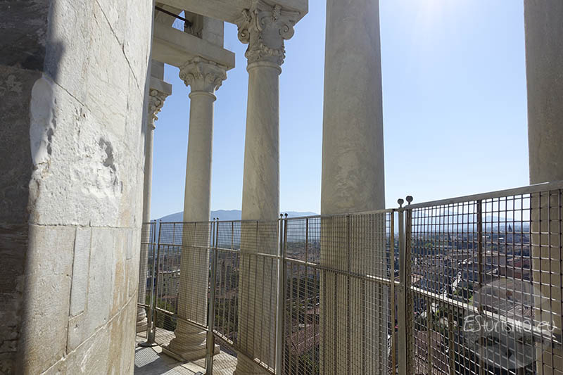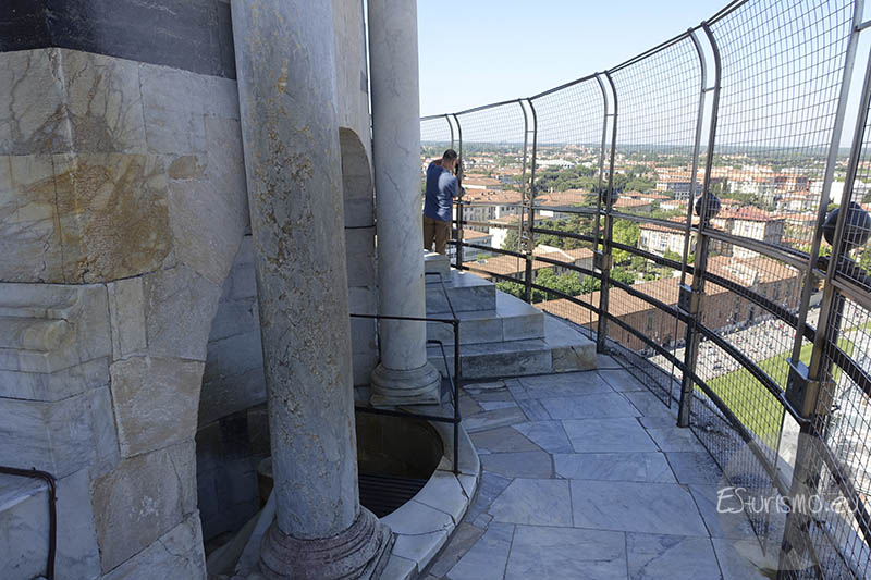 La primera vez que salimos al exterior fue en la sexta planta de la torre, donde comprobamos una vez más la evidente inclinación del monumento, a pesar de lo cual hay una vista de 360º de Pisa, la plaza de los Milagros, y todo el entorno. Lo primero que nos viene a la mente al desembocar en esta galería es el evidente peligro que antaño corrían las personas, puesto que antes el espacio resultante entre las columnas de la arcada no tenía ningún tipo de valla, como sí ocurre ahora. Recorriendo este anillo podemos ver más de cerca las columnas y sobre todo los capiteles, en algunos de los cuales se representaron caras, unas con una expresión más amable que otras.