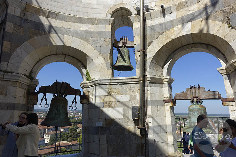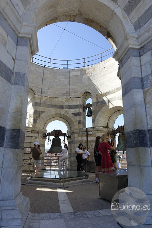 Aquí se alojan siete campanas que poseen cada una de ellas una nota musical diferente para anunciar ciertos momentos litúrgicos, como las vísperas, la tercera hora del día o fiestas religiosas como la Pascua. Aunque ya no se hacen sonar a la antigua usanza, puesto que no se permite balancearlas para evitar vibraciones que pudieran empeorar la inclinación de la torre, en la actualidad sólo se escuchan mediante un sistema electrónico. Cada una de las campanas tienen nombres, que son: Assunta, Crocifisso, San Ranieri, Dal Pozzo, Pasquereccia, Terza y Vespruccio. La más antigua de todas es Pasquareccia realizada por Lotteringio di Bartolomeo en 1262, la cual fue utilizada para anunciar la muerte del conde Ugolino della Gherardesca, acusado de traición y encerrado en otra torre y sentenciado a morir de hambre junto a sus hijos y nietos.