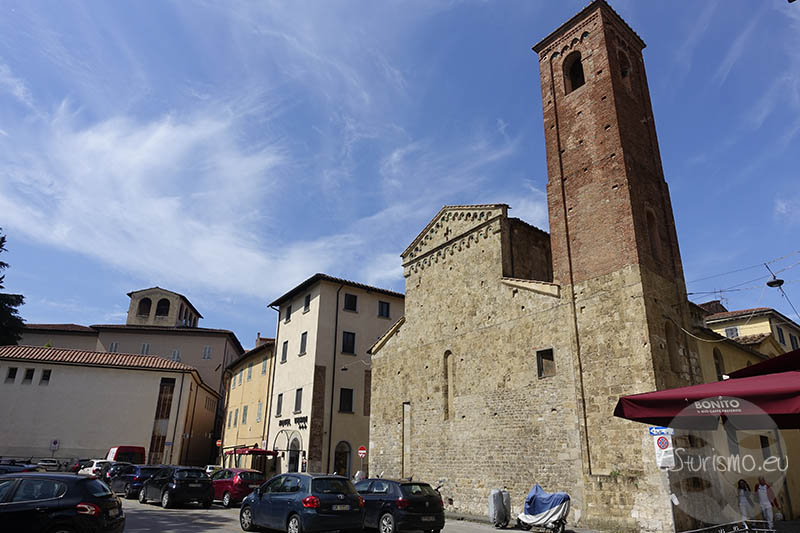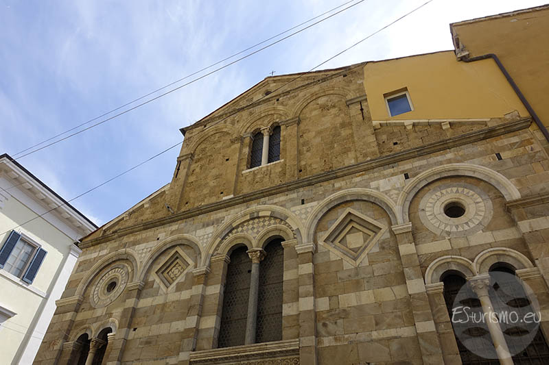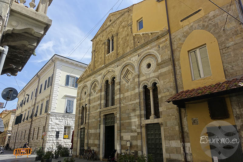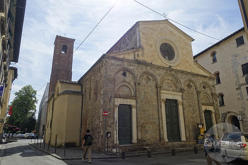 La fachada se organiza en dos niveles: el inferior presenta cinco arcadas ciegas adornadas con rosetones y losanges, y tres portales de entrada con arquivoltas decoradas, de las que el central está coronado por un arquitrabe esculpido con motivos florales. En el nivel superior destacan tres arcadas con una bífora central. El campanario se encuentra en una torre cercana que en origen tuvo función residencial. Por su parte el interior se compone de tres naves separadas por dos filas de columnas y pilares con capiteles románicos. El suelo conserva mosaicos de mármol policromado del siglo XII con diseños geométricos. Antes de la conquista florentina, este templo albergó un valioso manuscrito jurídico: el Digesto de Justiniano I, parte del Corpus Iuris Civilis, conocido como las “Pandectas Pisanas”, hoy conservado en la Biblioteca Medicea Laurenciana de Florencia.