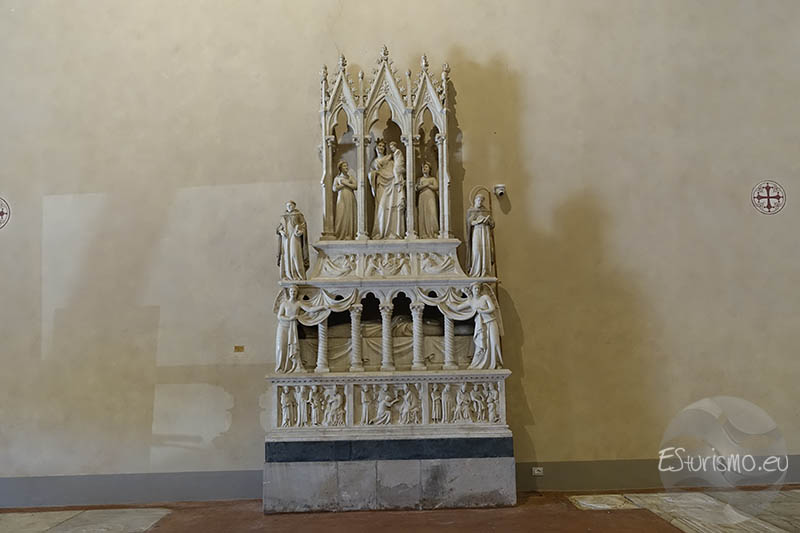 De todos los edificios que rodean la plaza, nosotros nos vamos a centrar en la iglesia de santa Catalina de Alejandría, la cual fue edificada a comienzos del siglo XIII, aunque adquirió su forma actual tras ser entregada a los dominicos en 1222, cuando se levantó también el convento adyacente. La fachada, concluida en la primera mitad del siglo XIV, está revestida con mármol blanco de San Giuliano Terme y presenta un diseño gótico con franjas bicromas en blanco y gris. Sus arcos y columnas decorativas, junto con los bustos de santos en altorrelieve que rodean un gran rosetón central, evocan el estilo de la Catedral de Pisa. El campanario de ladrillo se atribuye a Giovanni di Simone, el mismo autor del de san Francisco y del Camposanto Monumental.