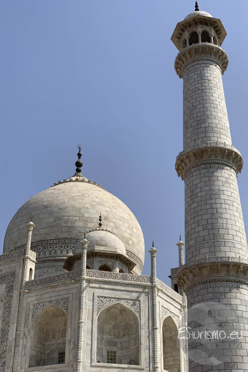 Nos centramos ahora en el mausoleo de mármol blanco construido, al igual que el resto del complejo, entre los años 1631 y 1648 por orden del emperador mogol Shah Jehan para su esposa favorita, Arjuman Banu Begum, y para él mismo, por lo que se trata de un monumento al amor. Lo primero que nos llama la atención es que cada una de sus fachadas están compuestas por pishtaqs (básicamente es un portal con forma de marco que encuadra un arco) que abarcan dos pisos, enmarcado con una banda con inscripciones, mientras que en las enjutas de los arcos vemos de nuevo incrustaciones con forma de enredaderas, flores y frutas, figuras que están muy estilizadas, casi geométricas.