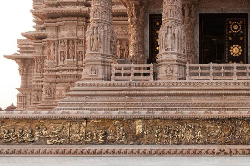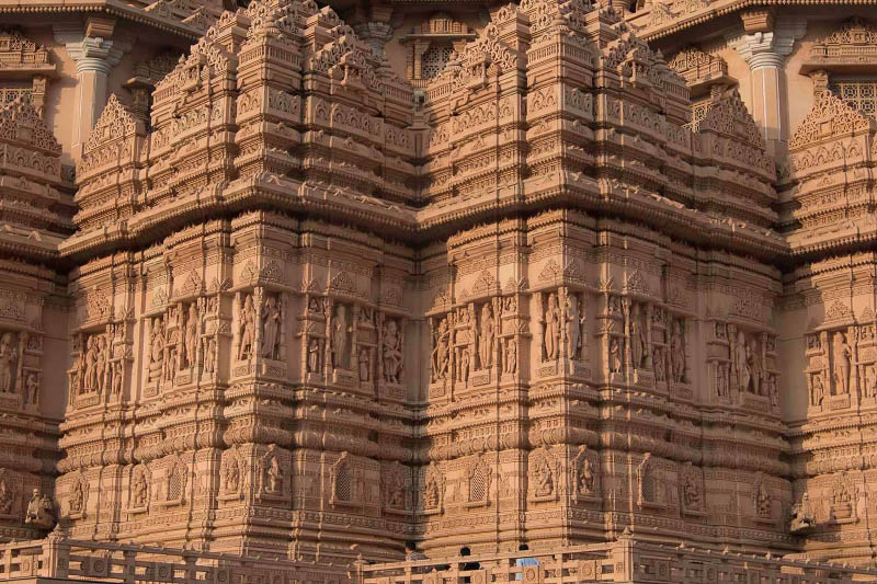 Antes de dirigirnos a su interior, debemos dejar los zapatos en una de las dos casetas que flanquean el camino que precede al mandir. Allí os darán una bolsa donde meterlos y, tras entregarlos al responsable, os darán una ficha con un número para recuperarlos después. El edificio fue construido con piedra rosada y mármol blanco, elevándose a una altura de 43 metros, 96 de ancho y 108 de largo. Dentro del mandir, los 234 pilares intricadamente tallados, las 9 cúpulas ornamentadas y los 20 pináculo cuentan una historia de devoción, ofrecen el darshan de una deidad o narran algún capítulo de la vida de Bhagwan Swaminarayan.