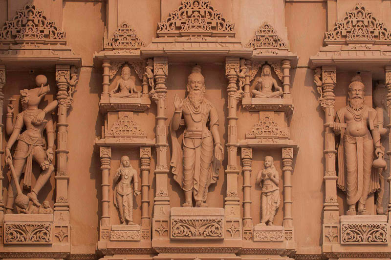 Volvemos al exterior para dar un paseo alrededor del mandir. La fachada exterior de un templo de piedra tradicional se conoce como mandovar: el que aquí vemos es el más grande e intrincadamente tallado construido en la India en los últimos ochocientos años. Tiene 190 metros de largo por 7,5 de ancho, constando de 4.287 piedras que incluye 200 figuras de piedra esculpidas que representan a figuras hindúes, como rishis, sadhus, devotos, acharyas y avatares del hinduismo y 48 murtis de Ganesha. Vamos a hacer una descripción más completa a continuación.